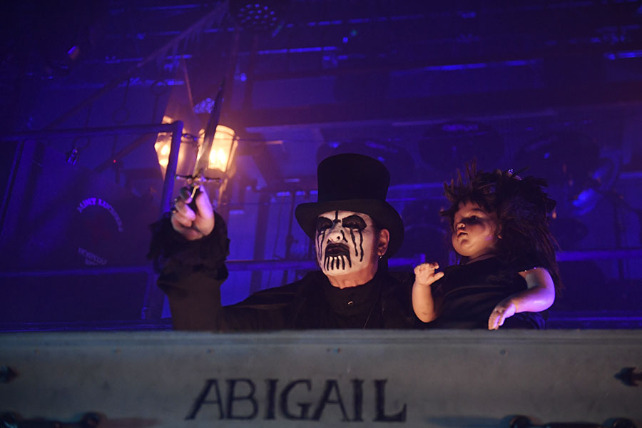 As with an Alice Cooper show, a King Diamond performance is a much about the theatrics as it is about the music. A Mansion in Darkness sees a lost lantern-bearing female wandering the stage, as long-time collaborator Andy LaRocque and guitar partner, Mike Wead, trade licks and build soaring sonic structures. Clutching his familiar crossed bones microphone, the King becomes both a narrator of macabre tales – a Lovecraft or Poe – and the central protagonist / antagonist. Halloween arrives early and bathes the stage in orange light and shadow; Voodooopens with the rhythms of the American southern bayou region and finds one of the actors entranced into a zombie by the enticing beats.