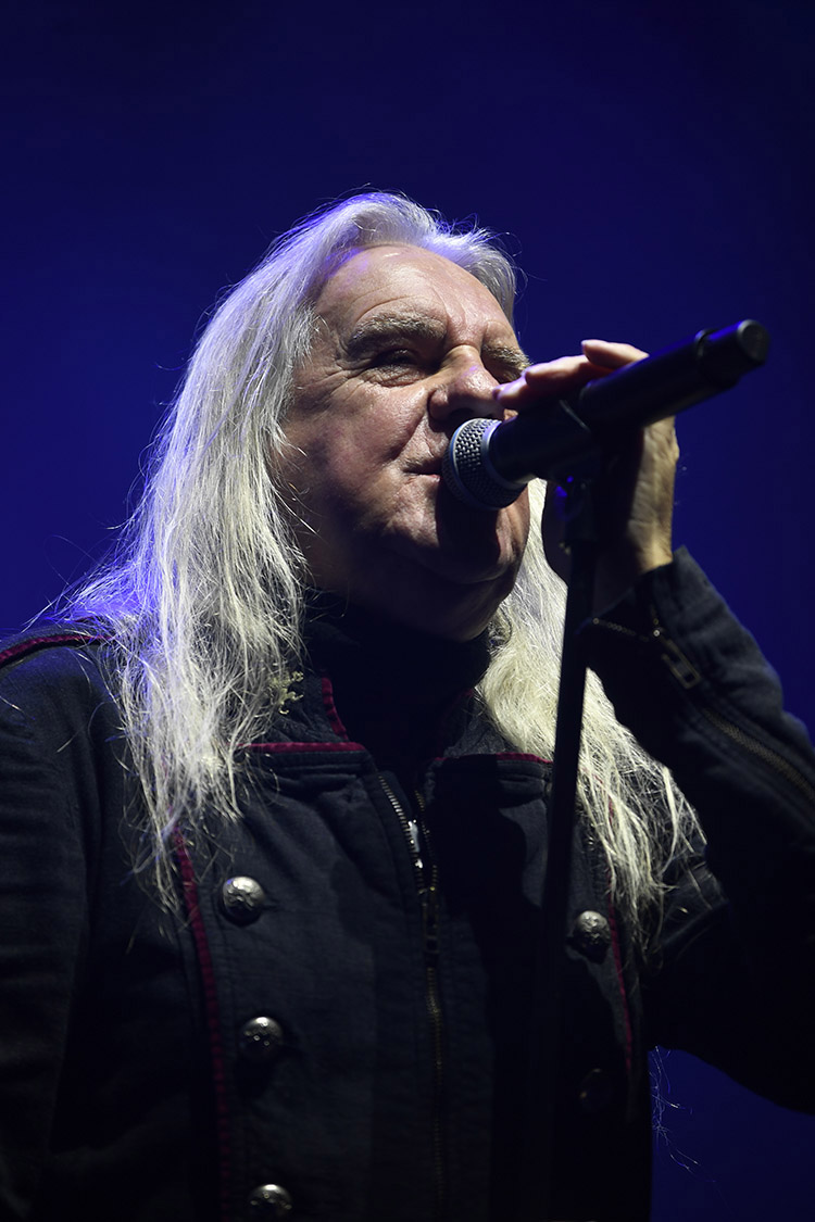 As the lights came on Saxon were stood as a group on the drum-riser, hair and denim galore; singer Biff Byford dressed in his long tunic coat waves of white hair contrasting. 'Hell Fire and Damnation' started things off in fine fashion, these legends of the NWOBHM era know how to rock and thus it seems fitting that Diamond Head Guitarist, Brian Tatler is now a member of Saxon.